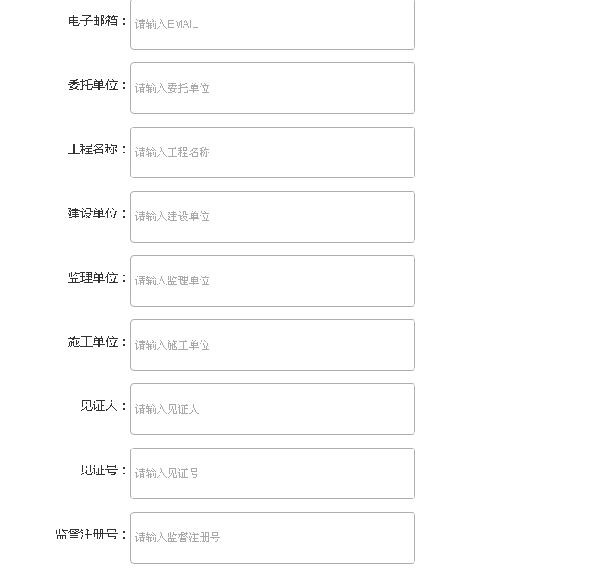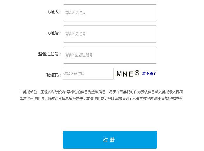 2.注册页面内容见下图(图4、图5、图6)。登陆账号、密码、手机号、真实姓名等带*号和绿色圆形图标标志的信息为必需填写信息(图4),下面的工程、单位、见证人信息为可选填信息(图5),注册的时候可不填写,在以后的使用过程中还可以补填完整;建议填写完整,因为后期使用平台进行委托时,将会使用此处信息作为默认信息带入信息录入界面,从而减少输入工作。进行用户注册时,为了避免恶意注册,需要录入验证码信息(图6)。
