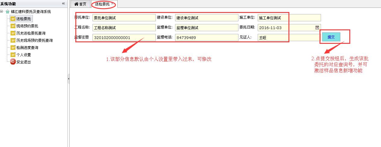1.样品信息的委托分送检委托和现场预约委托,两者操作方法一样,下面以送检委托为例加以说明(图7)。可通过网站首页的送检委托功能直接登录打开委托页面,或者平台登陆功能区登录后,点左侧的功能菜单区的送检委托打开页面。页面中的默认信息从个人设置那里带入,可进行编辑,确认信息无误后,直接点[提交]按钮即可生成查询号或者叫委托号(网络)。