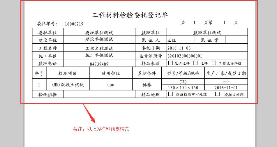 2.委托信息提交成功后,页面即可显示出样品信息(图8)。可通过[增加]按钮,调出样品信息录入页面,进行信息录入和保存,可通过[编辑]按钮对已录入的样品信息进行修改,可通过[删除]按钮对本次委托不需要的样品委托进行删除。确认委托信息完整、准确后,即可将本次委托的信息进行打印,打印预览效果(图9)。