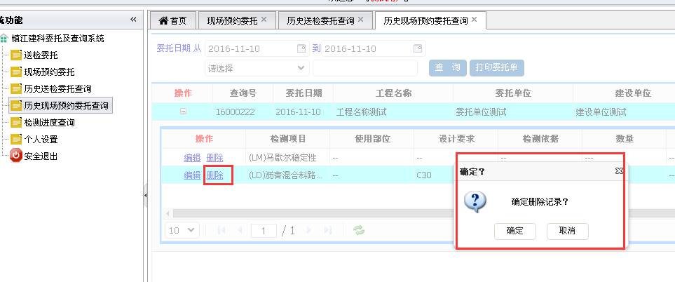 1.历史委托查询分送检委托和现场预约委托,两者操作方法一样,下面以送检委托为例加以说明(图10)。通过平台登陆功能区登录后,点左侧的功能菜单区的 [历史送检委托查询] 打开页面。页面中有委托日期和下拉选择框中的工程名称、委托单位、监理单位等查询条件可供使用,设置好查询条件后点[查询]按钮即可完成查询,选中某条样品信息记录后,点[打印委托单]按钮,可进行委托单打印(图13)。点开“+”号操作按钮,可显示某查询号(或者叫委托号(网络))下具体的每条样品信息,可针对某条样品信息进行编辑和删除操作。
