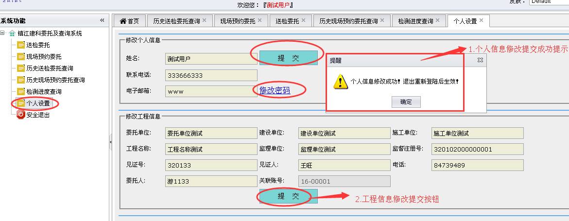 1.分个人信息修改和工程信息修改,分别修改和提交,修改成功后会出现成功提示(图14)。如需要修改密码直接点[修改密码]链接到密码修改页(图15)。通过[返回设置页]链接可再次回到个人信息修改页面。